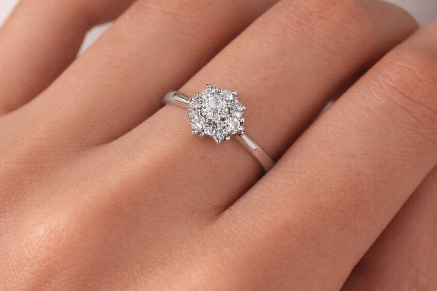 A cluster of finely set diamonds forms a luminous centre, creating the illusion of a larger stone while adding dimension and exceptional sparkle. The polished white gold band complements the cluster design, giving the ring a refined and sophisticated finish.